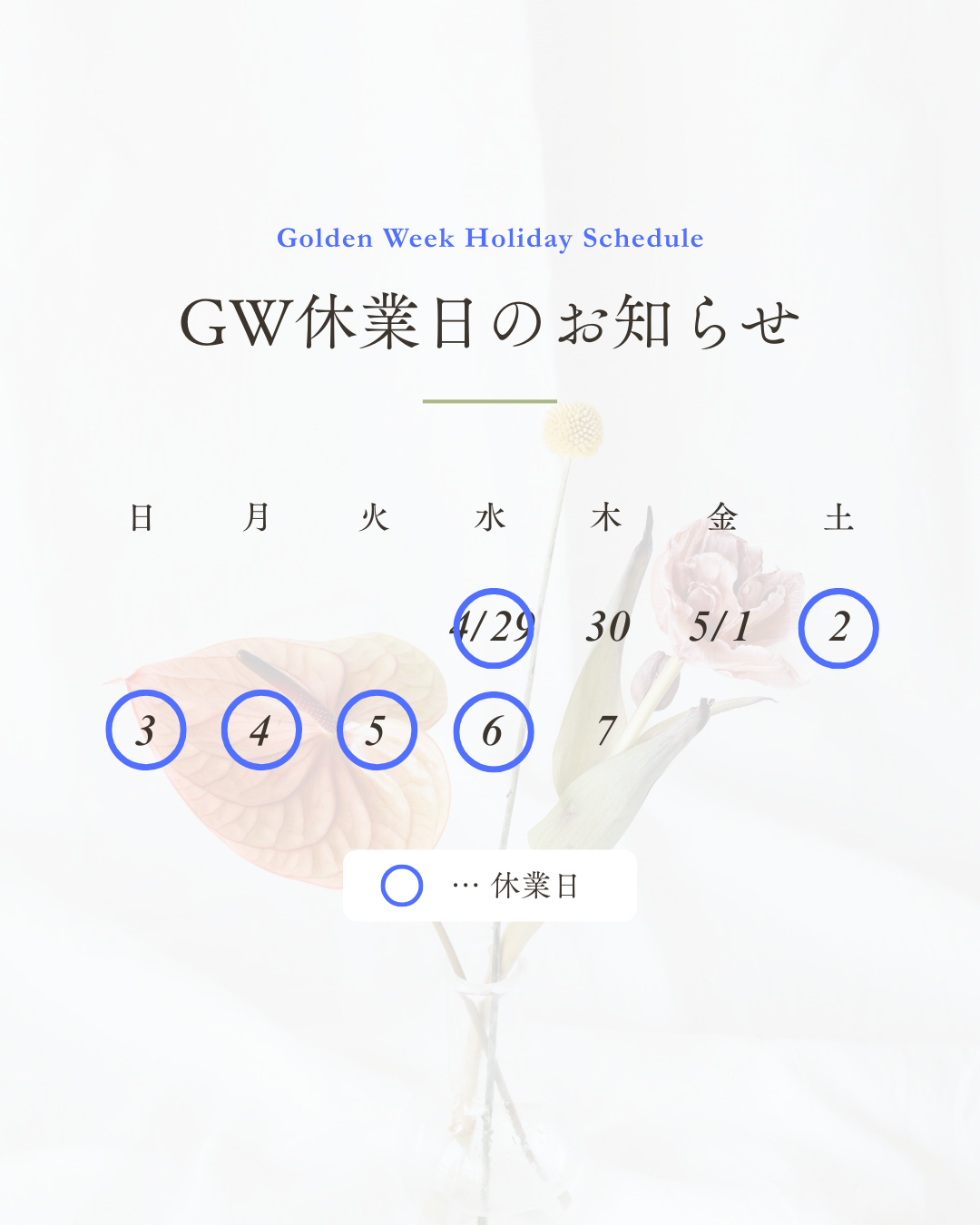 ゴールデンウィーク期間は暦通り(カレンダー通り)のお休みとなります。